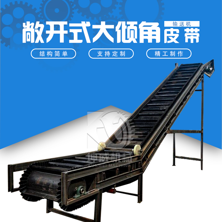 3、大傾角皮帶機非常適合輸送散狀物料,輸送角度能夠大傾角調(diào)節(jié),能夠達到普通、花紋式輸送機所不能達到的輸送角度。